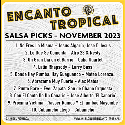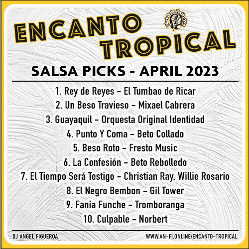 Encanto Tropical Salsa Picks is a monthly "Top-10 Songs" by DJ Angel Figueroa for the radio show Encanto Tropical. Selections are made from a Spotify playlist in collaboration with DJ Rem of salsa released in a given year (2022 | 2023 | 2024).